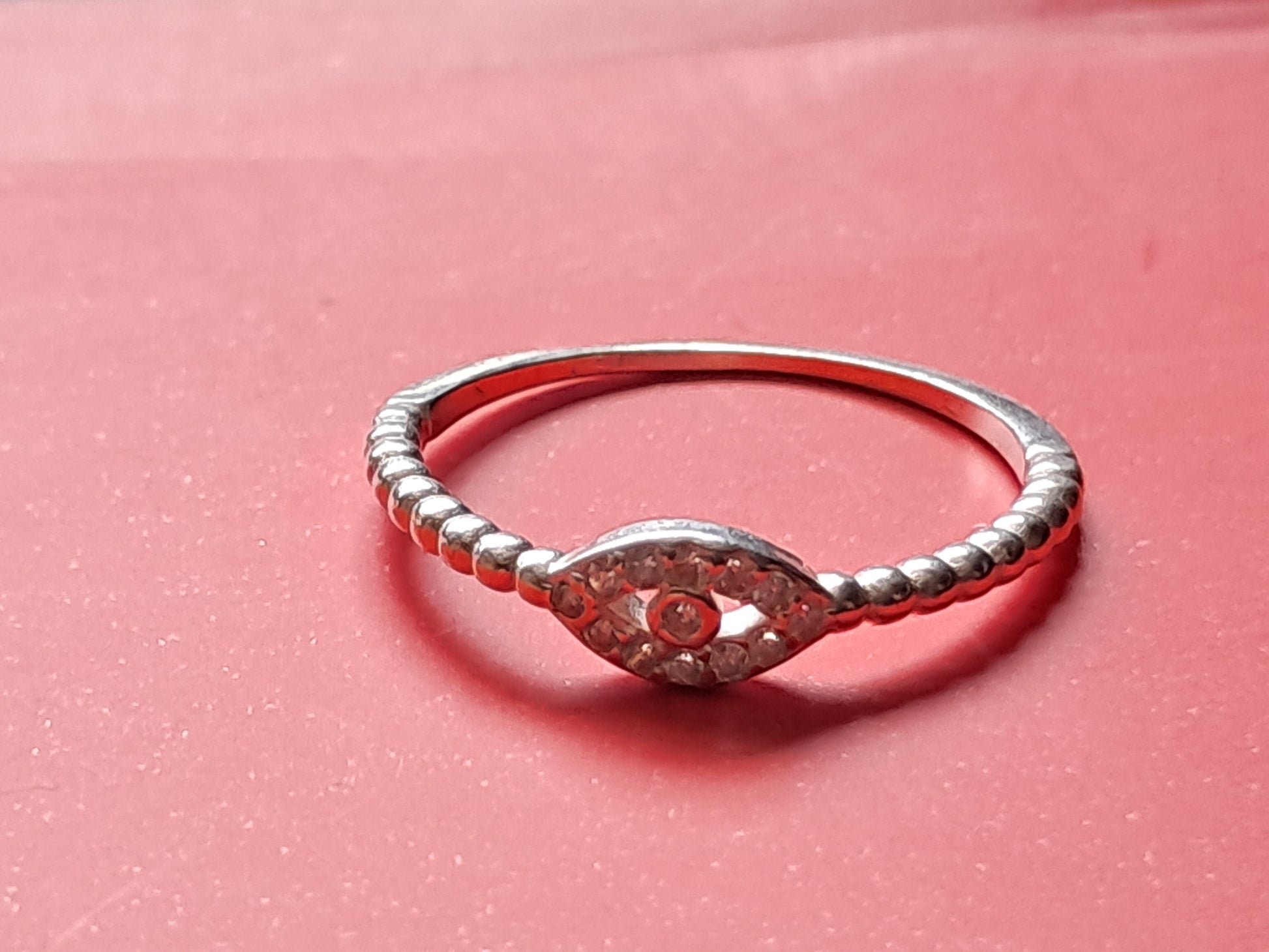 Anillo de plata 925 con diseño de ojo protector adornado con circonitas brillantes. La banda cuenta con un delicado acabado de esferas que aporta textura y elegancia. Ideal para quienes buscan un accesorio con significado y estilo atemporal.