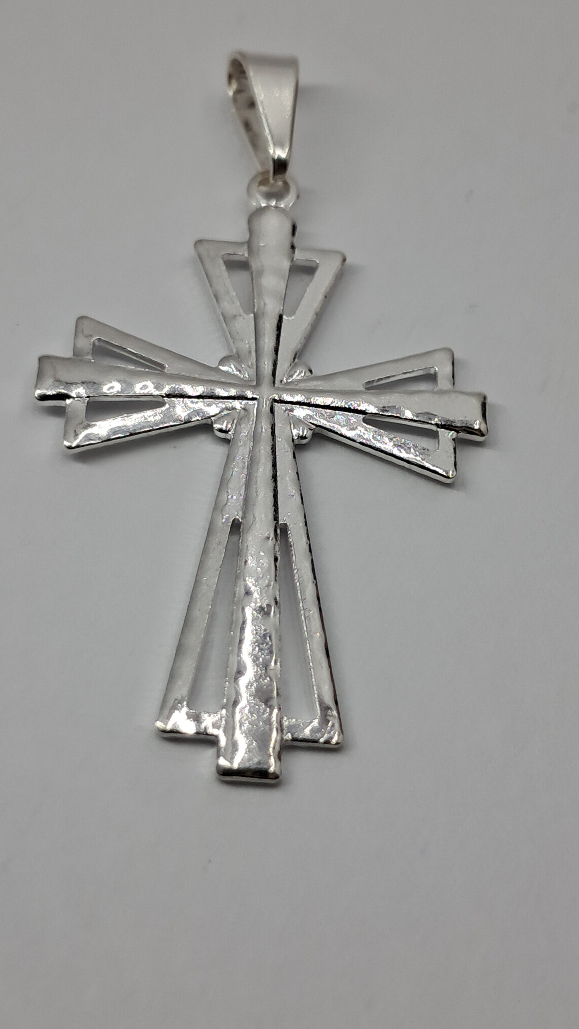 Una cruz moderna y elegante en Plata 925, con un diseño geométrico que combina líneas limpias y textura martillada para darle un brillo único. Ligera (1.6 g) y de 46 mm de alto, es perfecta para quienes buscan una cruz distinta, llamativa y con estilo propio.