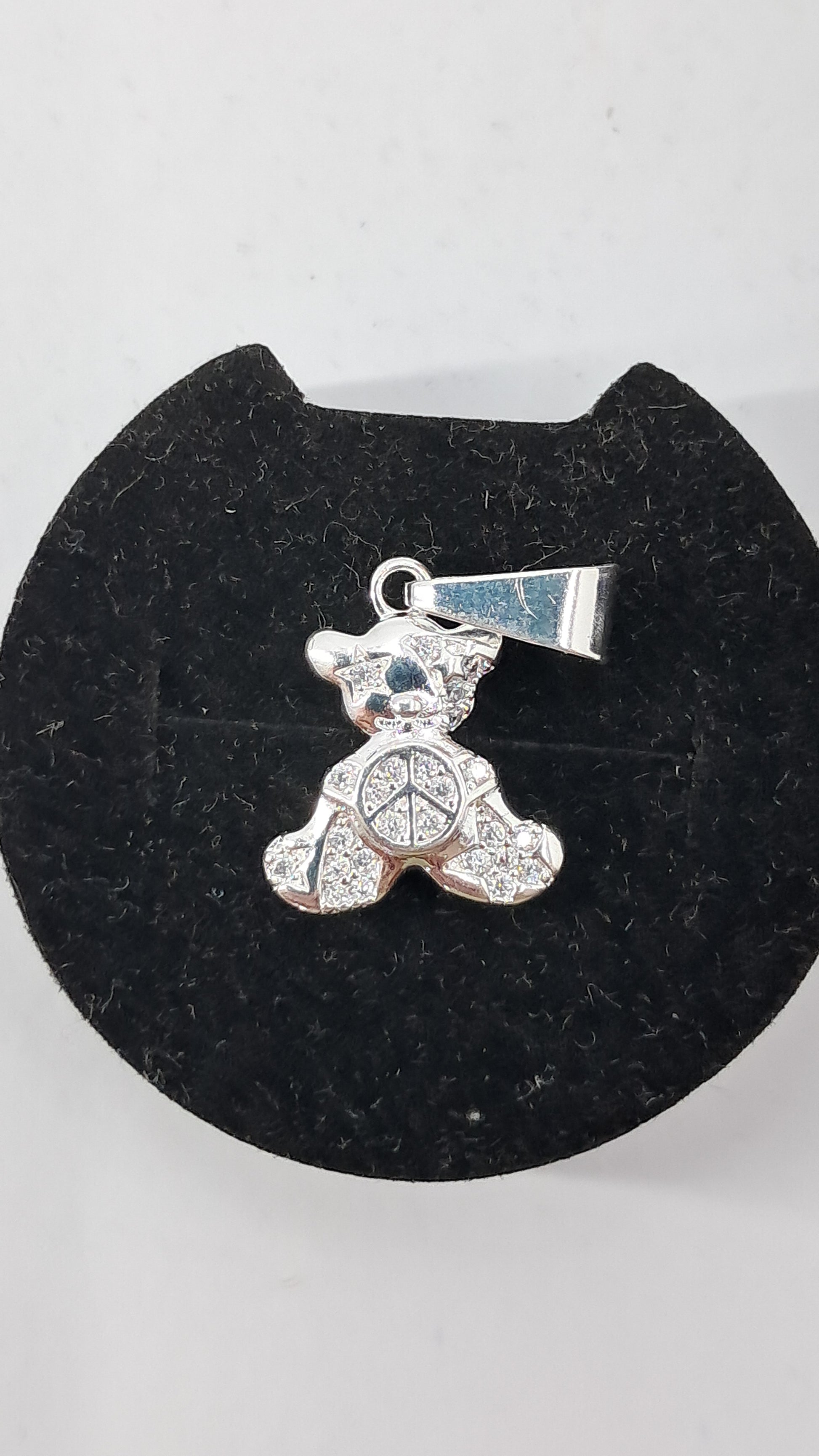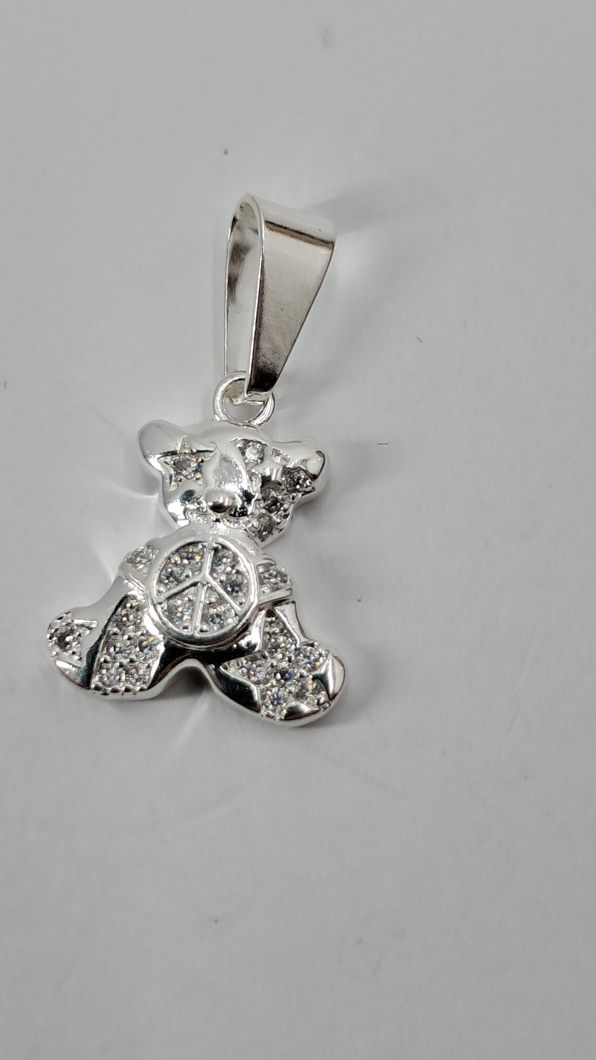 ¿Por qué este dije es especial? ☮️ Símbolo de paz en el centro - un mensaje que trasciende generaciones ✨ Más de 40 circonitas pavé que brillan desde todos los ángulos 🐻 Diseño osito de 20mm que derrite corazones 💎 Plata 925 genuina con trabajo artesanal superior