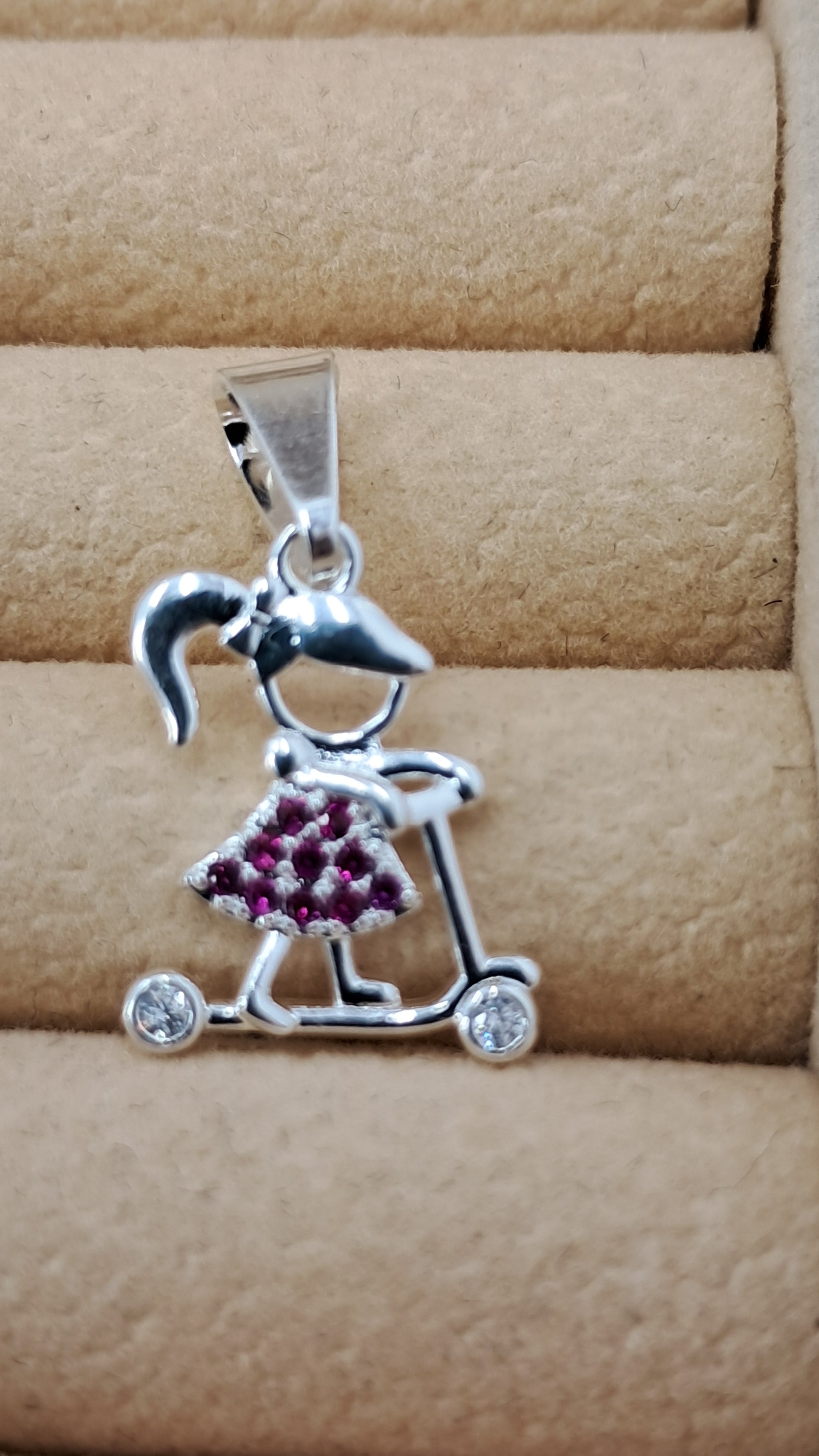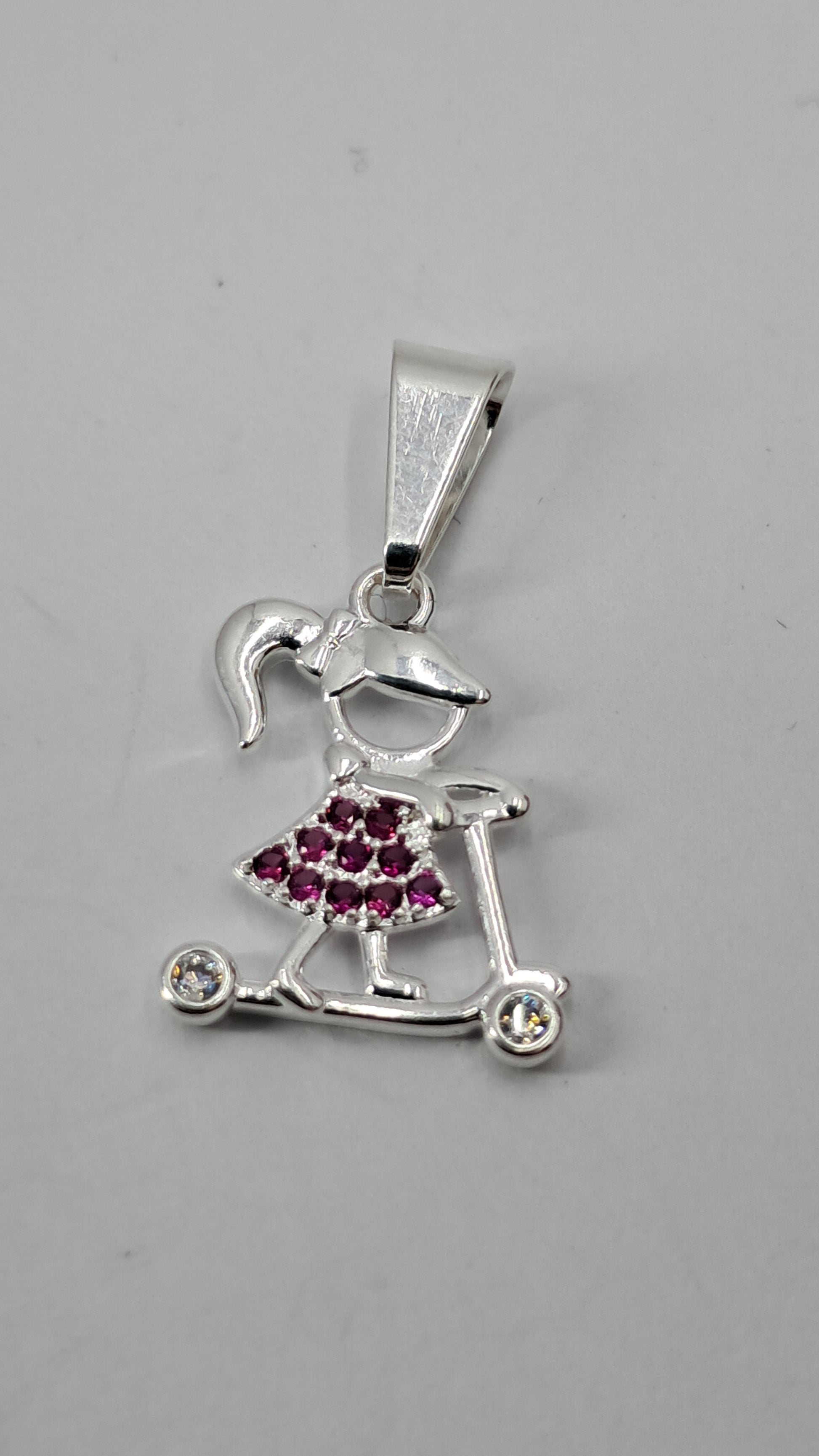 La infancia en movimiento perpetuo. Este encantador dije de plata 925 captura la magia de esos primeros paseos en scooter, con una niña de colitas cuyo vestido de circonitas púrpuras brilla mientras rueda hacia nuevas aventuras. Las ruedas con circonitas doradas giran con cada movimiento.