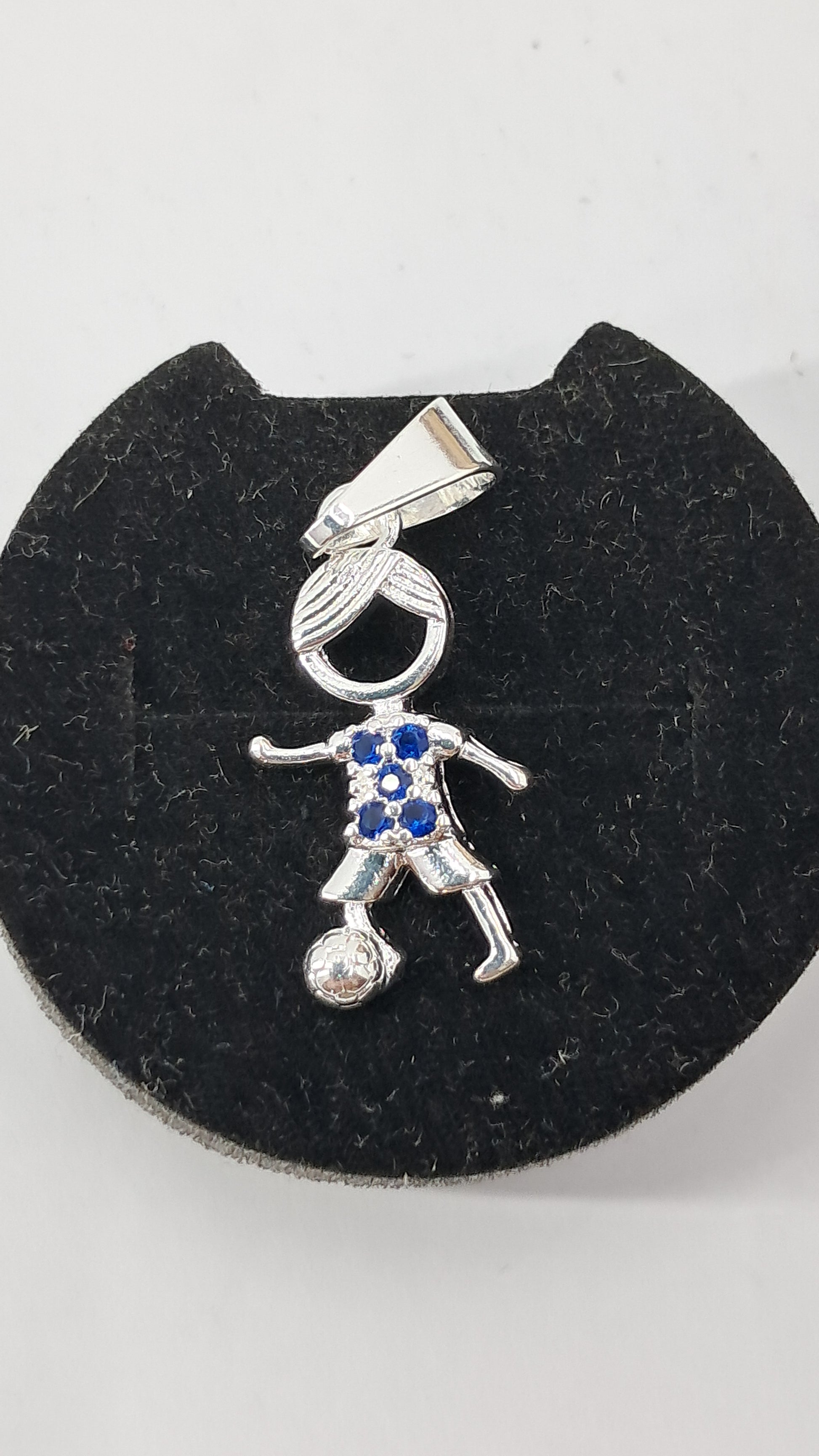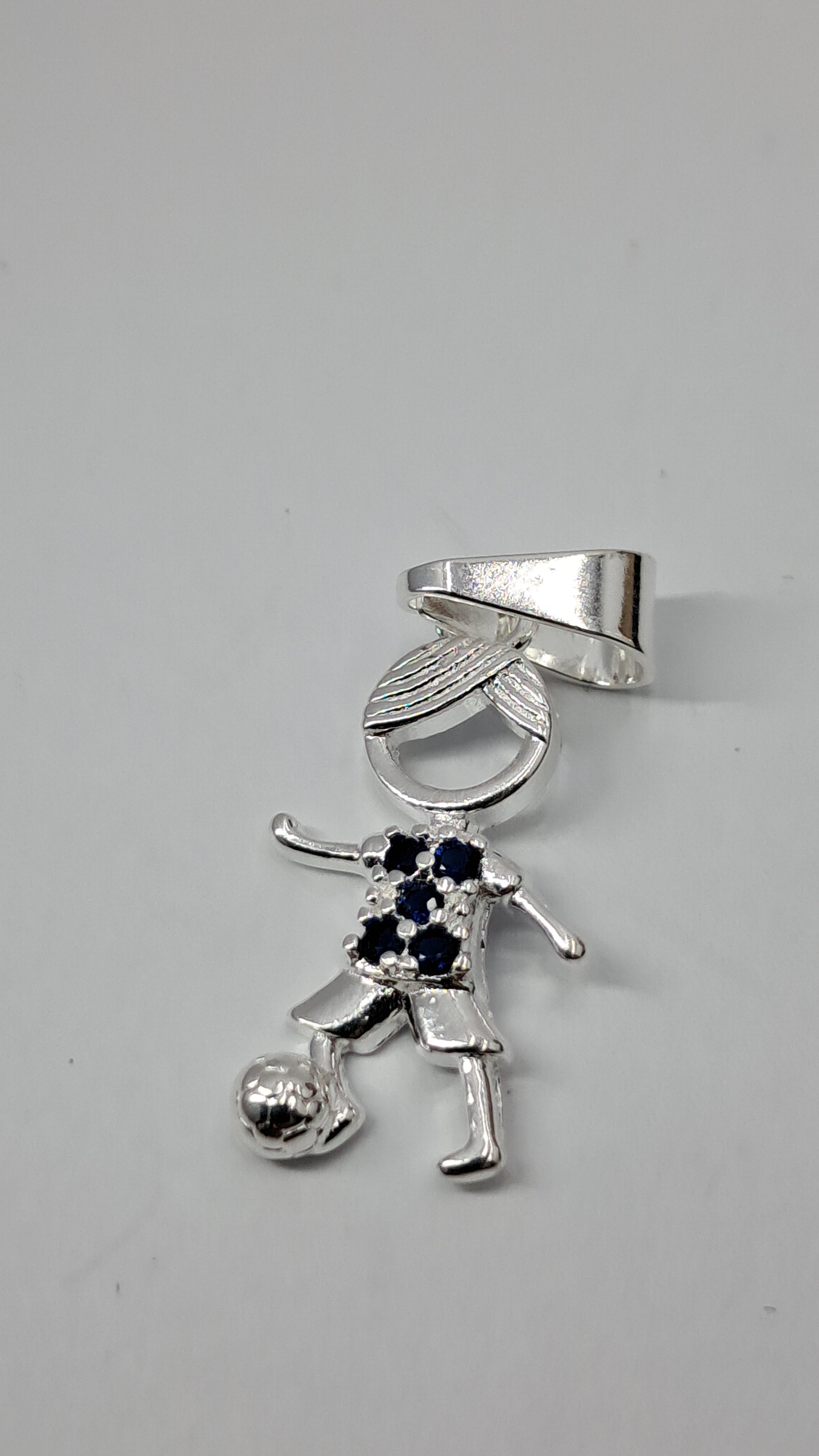 El fútbol también es cosa de niñas. Este inspirador dije de plata 925 celebra a las pequeñas guerreras que demuestran que con falda también se marcan goles. Su vestido brilla con 8 circonitas azules mientras domina el balón con gracia y determinación.