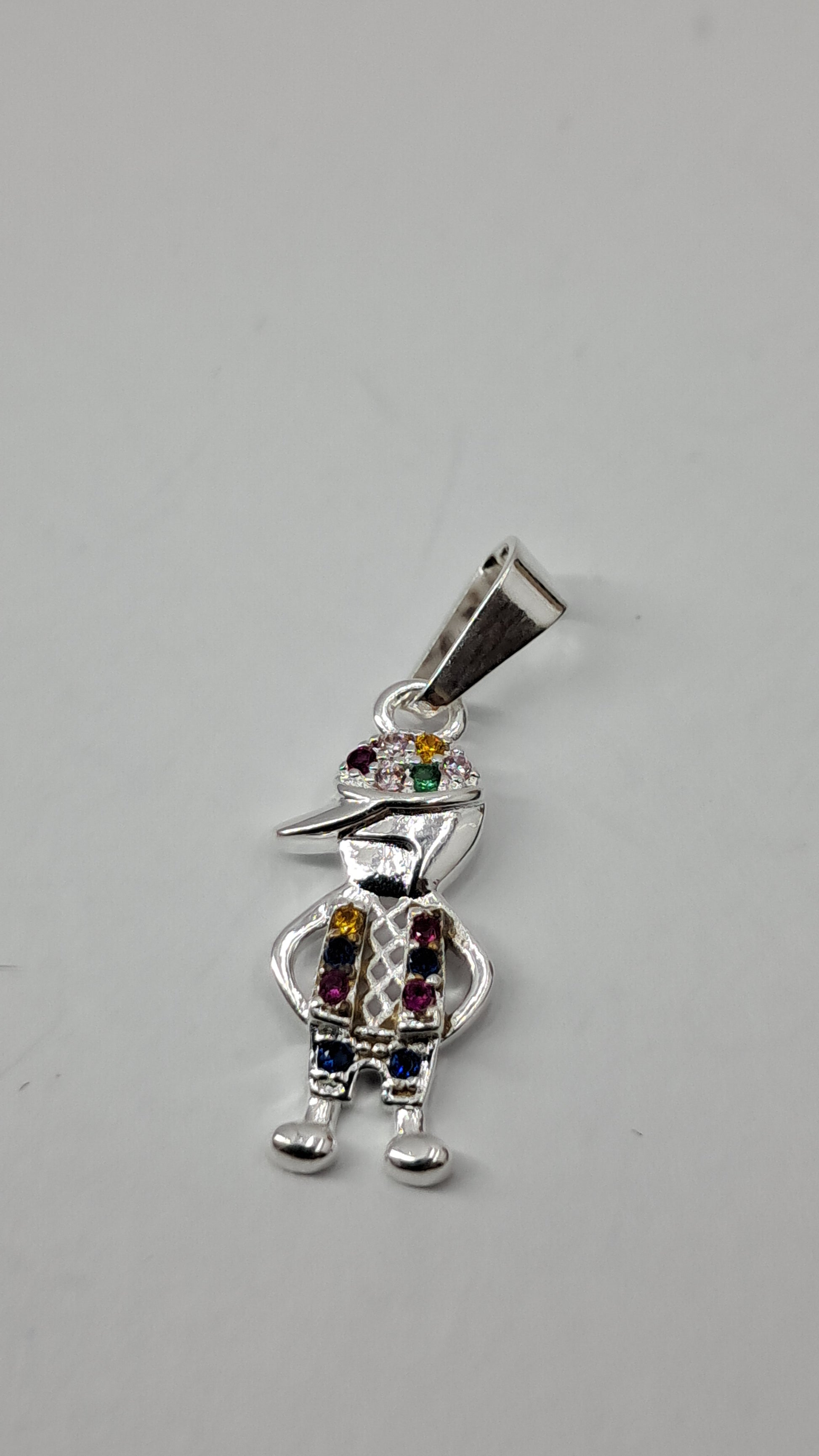 La travesura hecha brillos. Este encantador dije de plata 925 captura la esencia de la infancia aventurera: un niño con sombrero de explorador y overol decorado con circonitas multicolor que brillan como los ojos de un pequeño descubriendo el mundo.