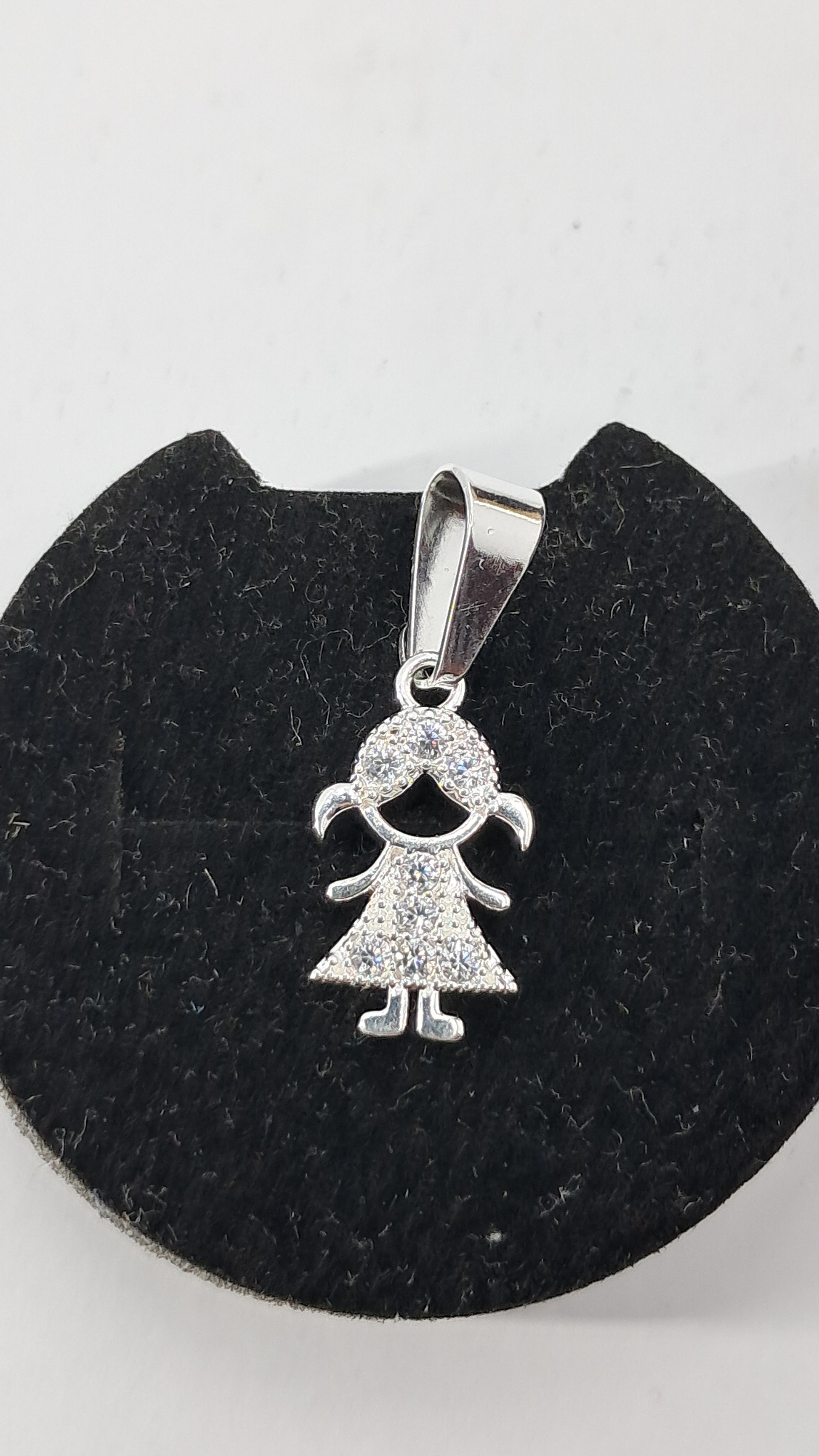 ¿Por qué este dije es especial? 👧 Diseño niña feliz con colitas y vestido triangular perfecto ✨ Más de 30 circonitas pavé que brillan como purpurina mágica 💕 Tamaño ideal de 22mm - visible pero delicado 🎀 El regalo perfecto para celebrar la magia de ser niña