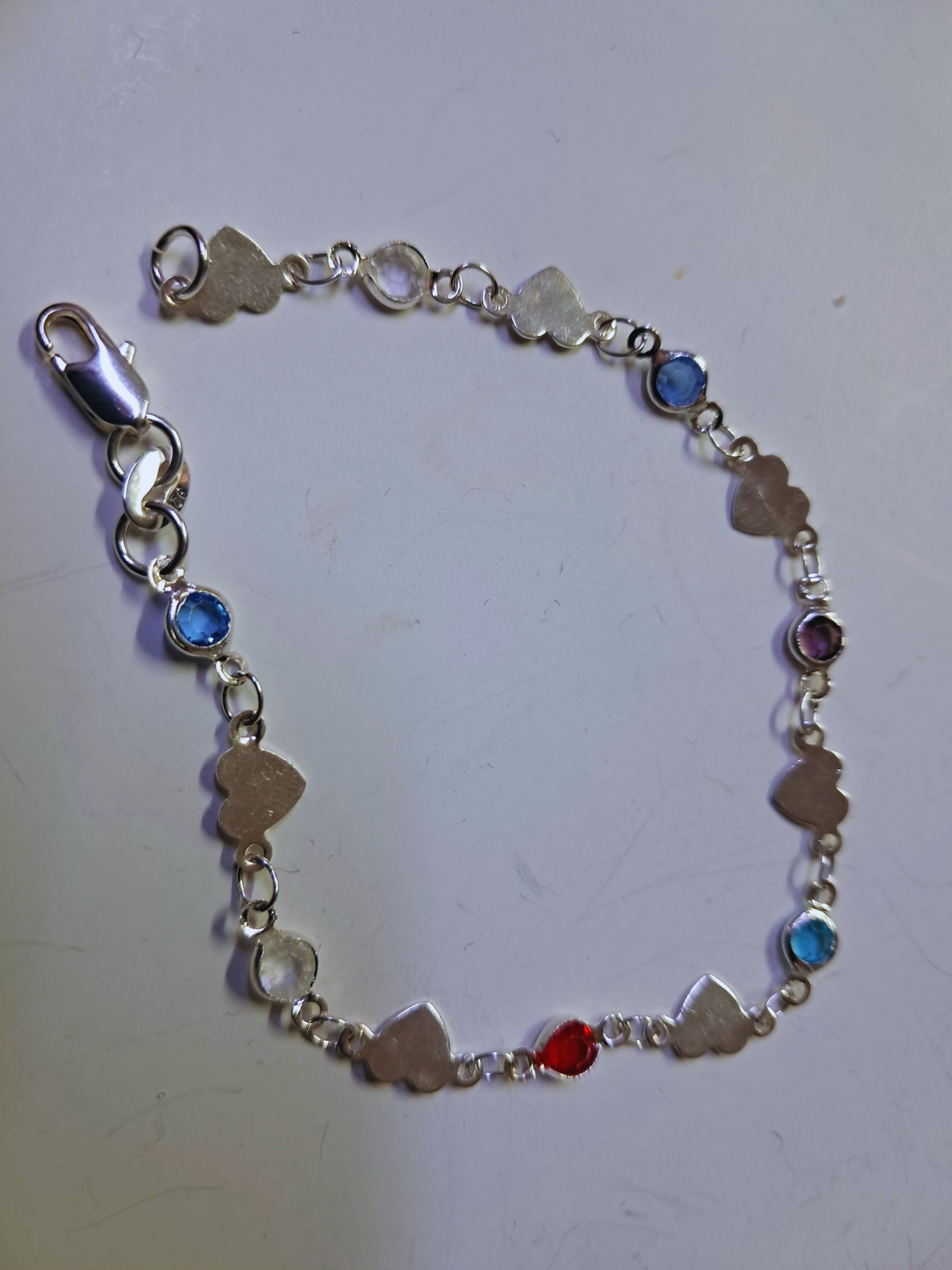 Delicada pulsera en plata 925 con eslabones en forma de corazones intercalados con circonias de colores en tonos azul, rojo, morado y transparente. Su diseño alegre y llamativo la convierte en una pieza versátil que aporta un toque juvenil y moderno a cualquier look.