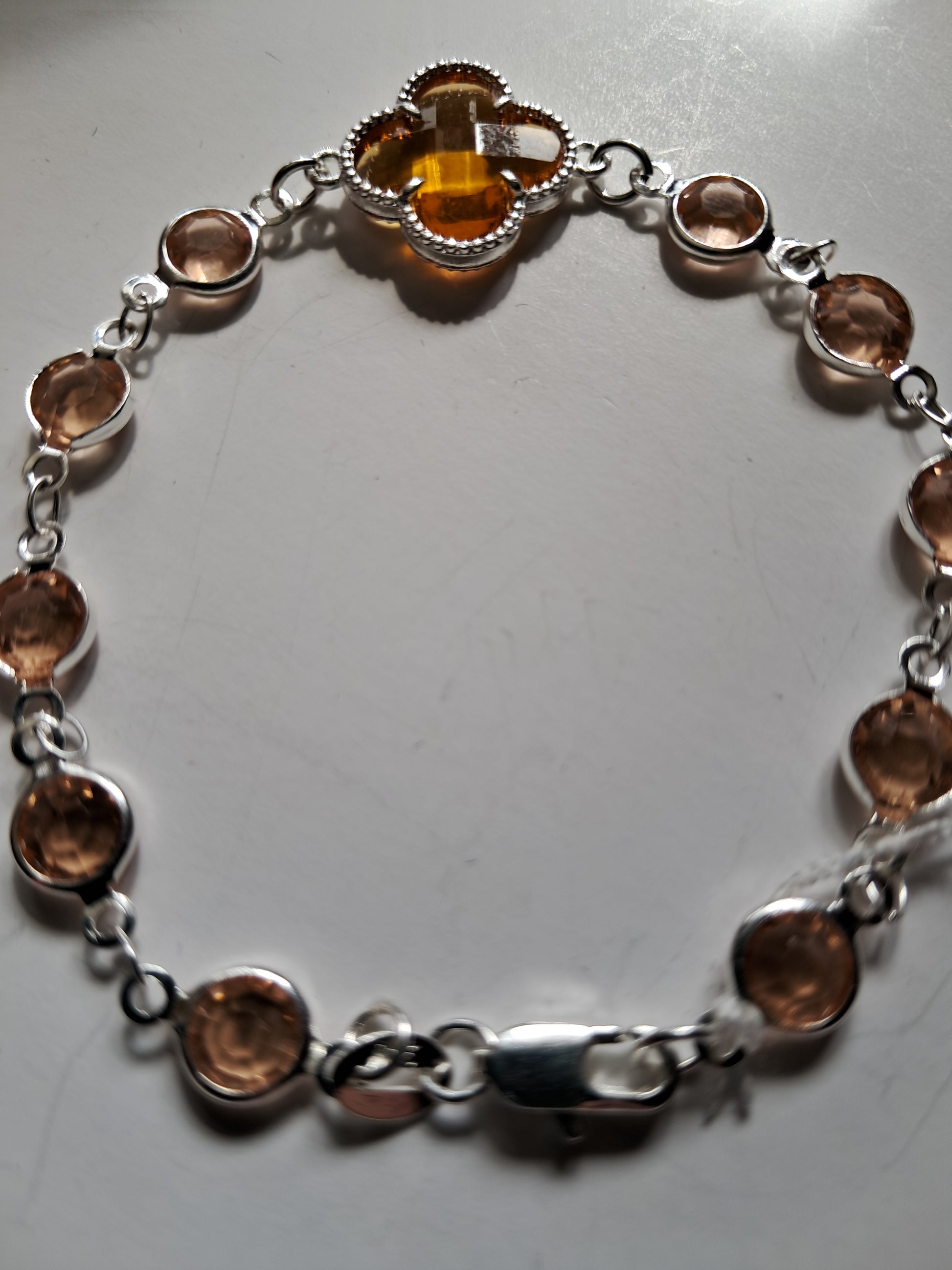 Elegante pulsera de mujer elaborada en plata 925, con un diseño único de eslabones circulares engastados con piedras de cuarzo citrino en tonos cálidos. Al centro, destaca un dije en forma de trébol con un cuarzo tallado que aporta brillo y sofisticación.