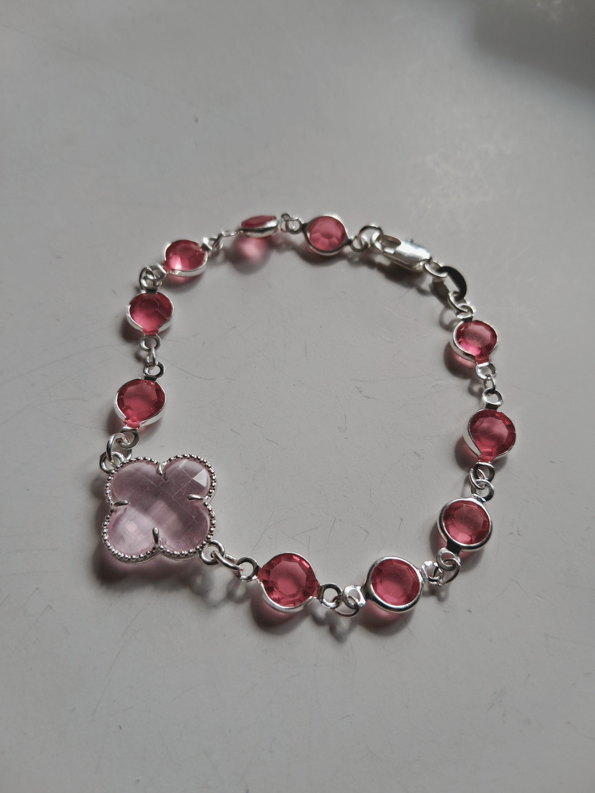 Pulsera de mujer elaborada en plata 925 con un elegante diseño de eslabones decorados con cristales en tono rosado. Su pieza central en forma de trébol con cuarzo rosa aporta un estilo delicado y femenino.