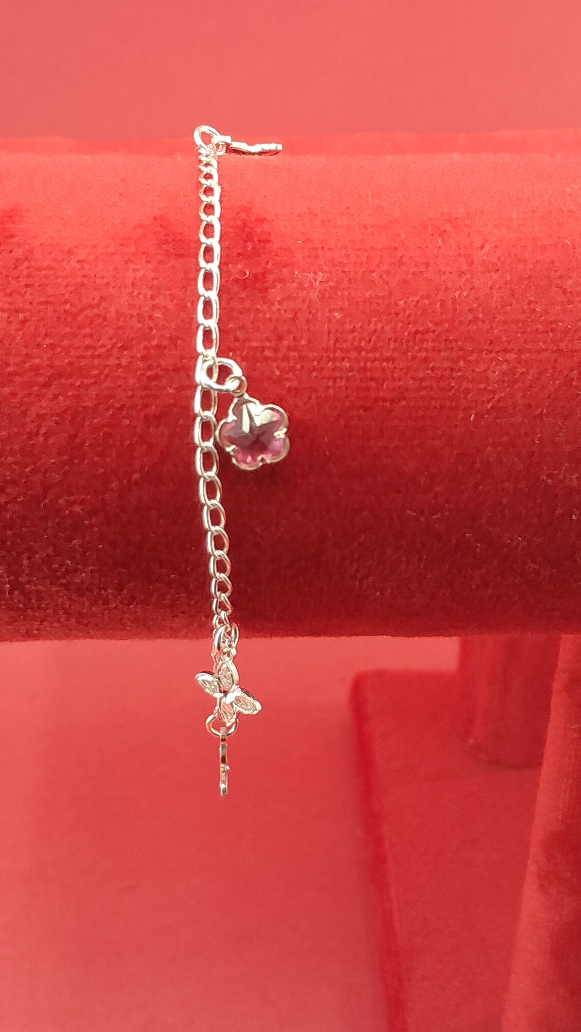 Pulsera de plata 925 con charms en forma de flores y un detalle de estrella con piedra roja que aporta un contraste elegante y llamativo. Una pieza ligera y versátil, ideal para un look delicado con un toque de color.