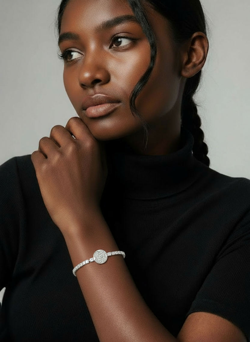 Pulsera de plata 925, compuesta por una hilera de circonitas engastadas tipo tenis y un detalle central en forma de trébol pavé, que añade brillo con un diseño equilibrado y sobrio. Ajustable para un calce cómodo.