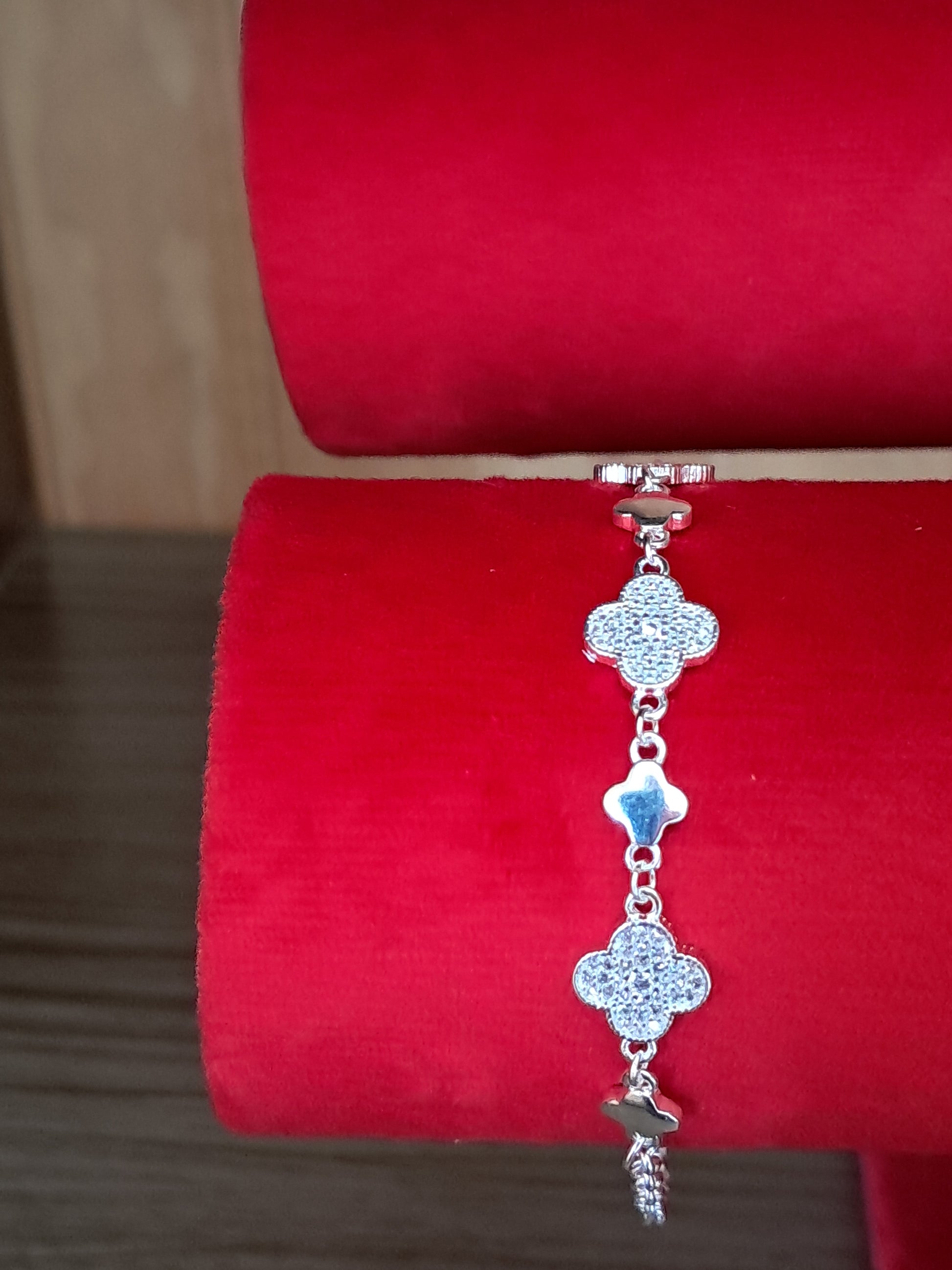 Pulsera confeccionada en plata 925, con una secuencia de tréboles lisos y tréboles pavé de circonitas. El contraste entre acabados pulidos y engastados aporta dinamismo visual manteniendo una línea elegante y equilibrada.