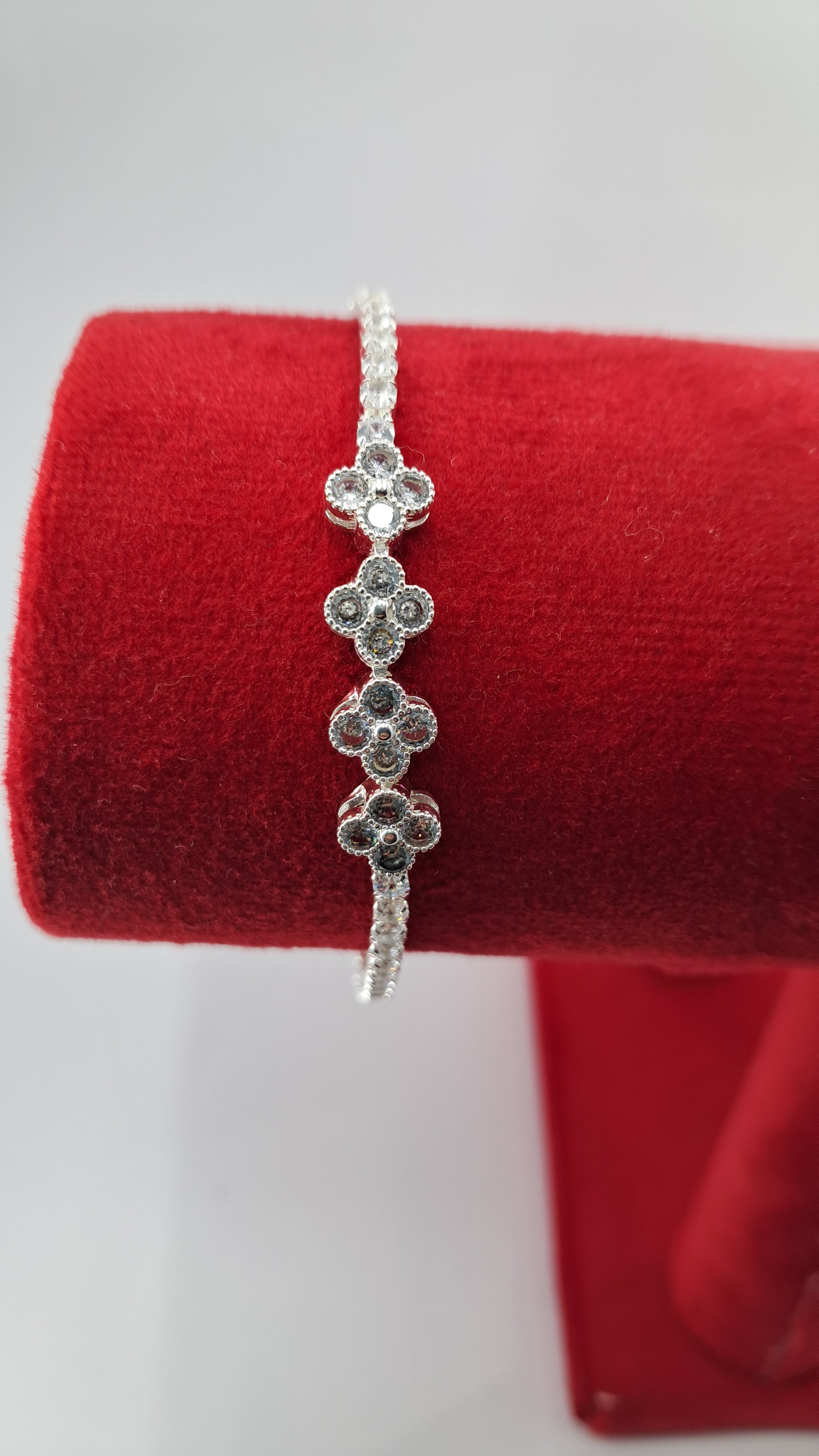 Pulsera elaborada en plata 925, con una secuencia de cinco tréboles engastados en pavé de circonitas. Cada motivo está conectado por eslabones finos que aportan flexibilidad y brillo continuo en todo el contorno.