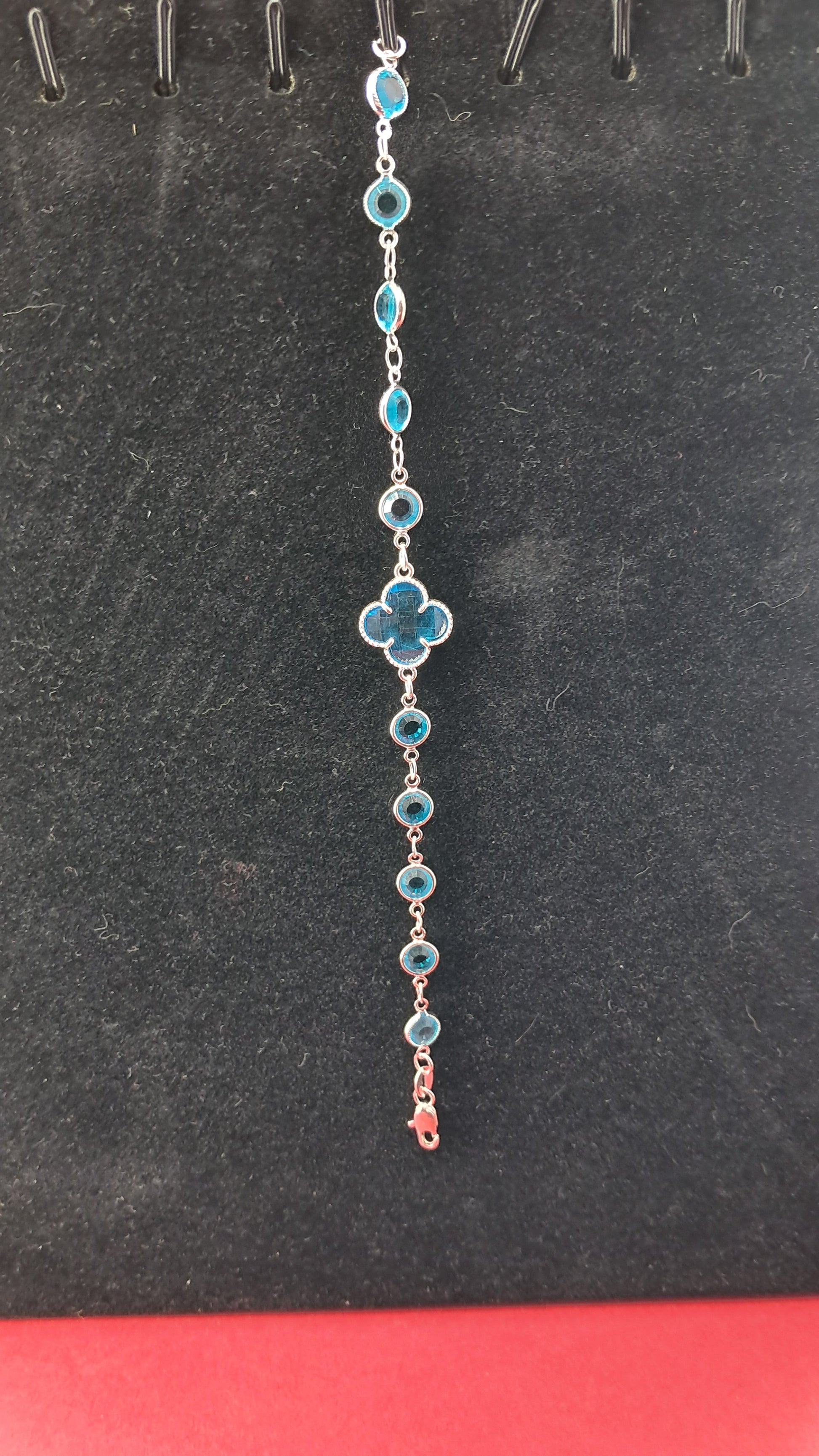 Pulsera de mujer elaborada en plata 925, decorada con piedras en tonos celeste intenso y trébol central facetado.