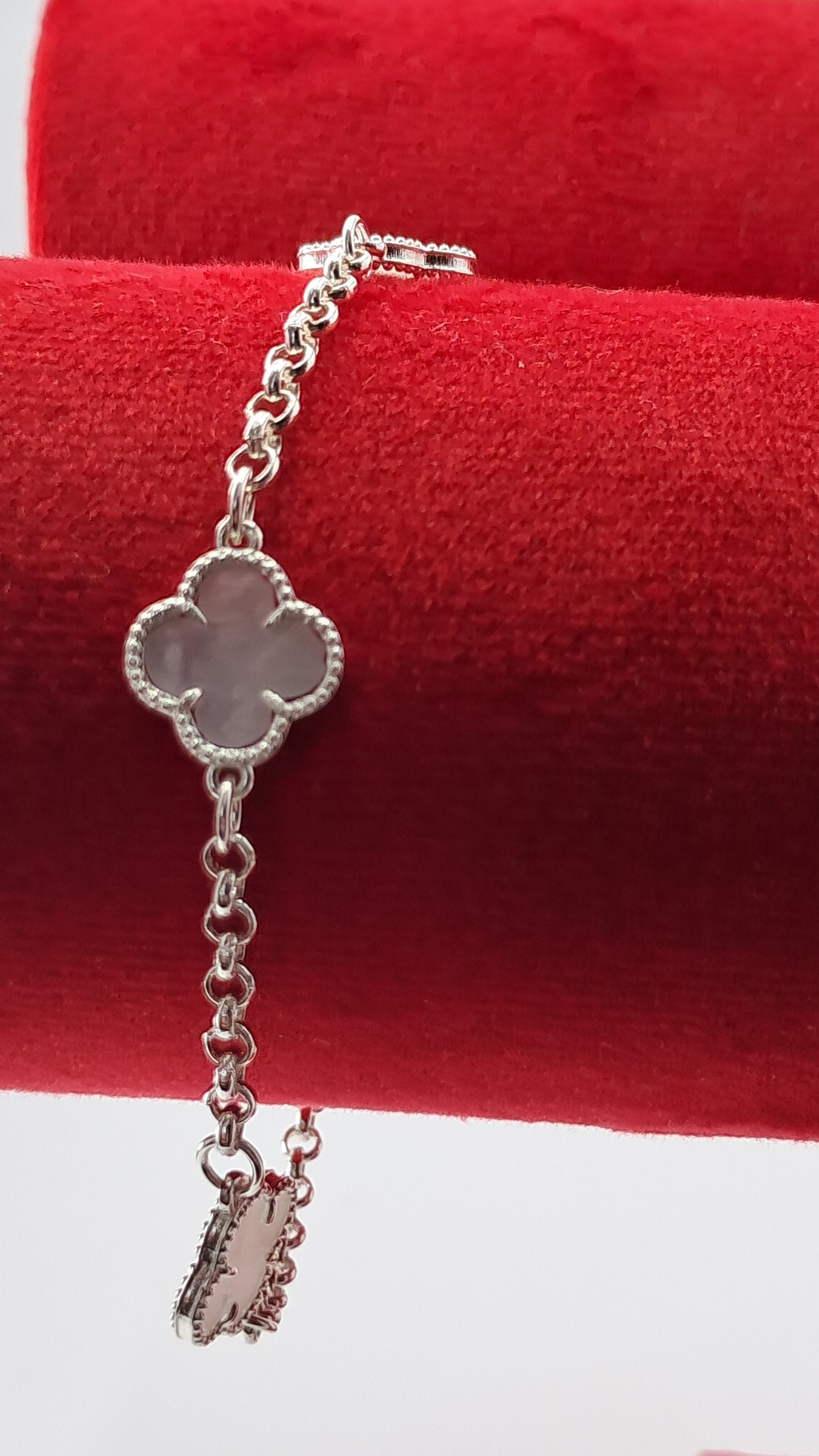 Tres pétalos, infinitas posibilidades. Esta exquisita pulsera presenta cinco tréboles de nácar natural engastados en plata 925, cada uno enmarcado con delicados bordes texturizados que capturan la luz como pequeños diamantes. Un símbolo atemporal de elegancia y buena fortuna.